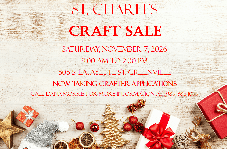 St. Charles School PTO is hosting a craft sale on Saturday, November 7th from 9:00 am to 2:00 pm. All handmade and homemade crafts are featured at our craft sale. We are taking applications for crafters now. Please call Dana Morris for more information at 989-388-1099.