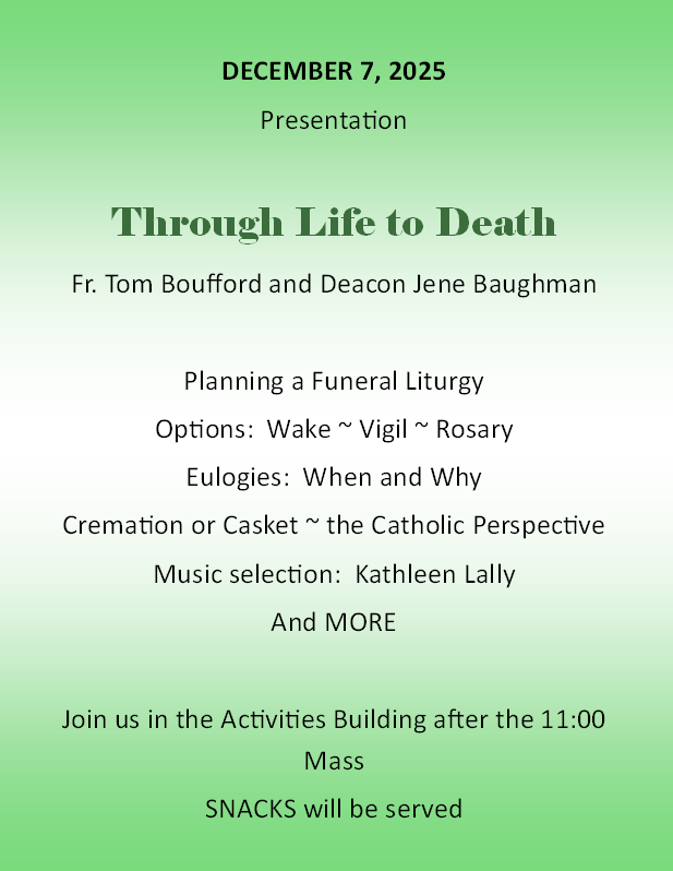 Fr. Tom Brown has graciously offered to hear confessions on Saturdays before the 4:30 PM Mass. Reconciliation will begin at 3:00 pm. Please watch the bulletin for schedule changes.
